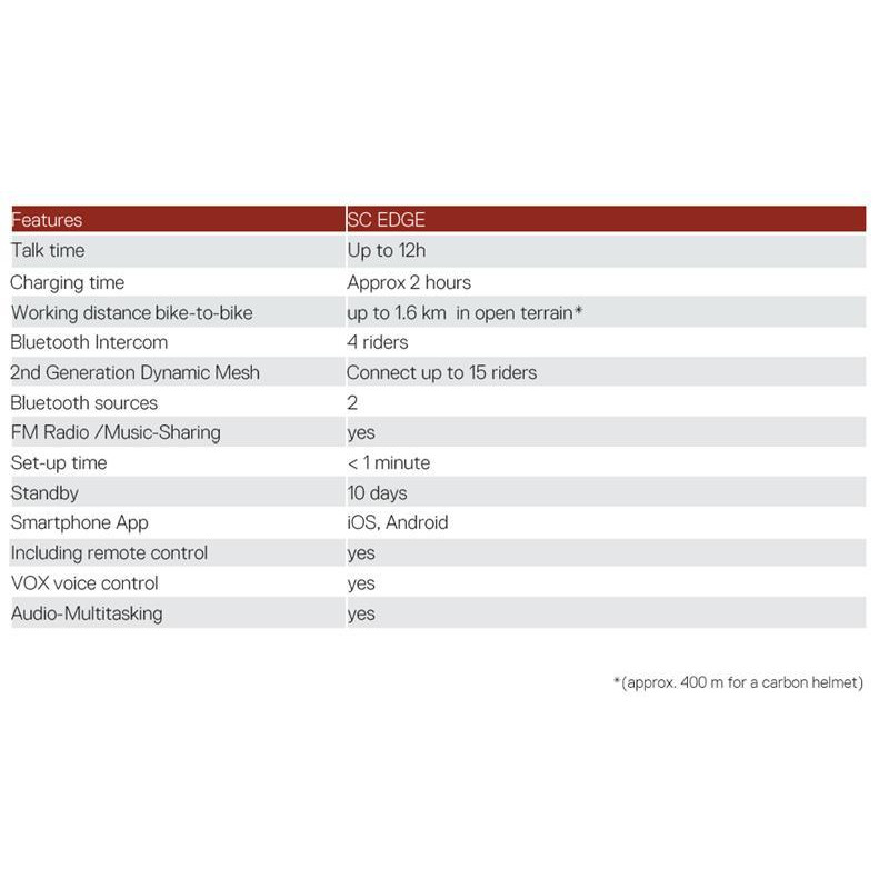 Teise põlvkonna Dynamic Mesh intercom-süsteemiga varustatud SC EDGE seab ühenduvusele uue standardi. See tehnoloogia koos Bluetooth 5.2-ga võimaldab siduda seadme mis tahes muu Bluetooth intercom-peakomplektiga, pakkudes sõitjatele ainulaadset võrgustikukogemust.